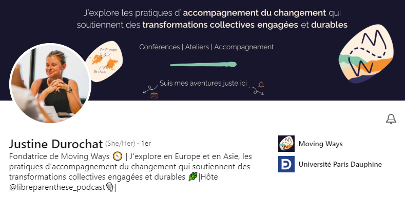 Qu’à cela ne tienne, Justine part bientôt en exploration, pendant un an, au cœur d'organisations en Europe et en Asie qui se transforment et qui créent un modèle engagé pérenne.